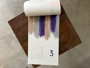 水縞が毎年模様を変えて作っている、月ごとにミシン目で切り離してめくっていくタイプのカレンダーです。毎月変わるグラフィックは、様々な素材をスキャンして作ったテクスチュアや自在ハンコを押して出来たモチーフなど、アナログな素材を掛け合わせてデザインしました。天面に開いた穴を利用してフックで壁にかけたり、切り離したものを壁に直接貼っても素敵です。お部屋のアクセントとして、ちょっとしたアート作品のようにお楽しみいただます。トレーシングペーパーの表紙つき。