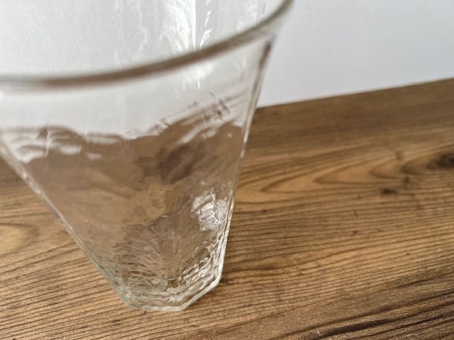 八角の底部から上に向かって緩やかに広がり、波紋のような模様が特徴的なグラス。
